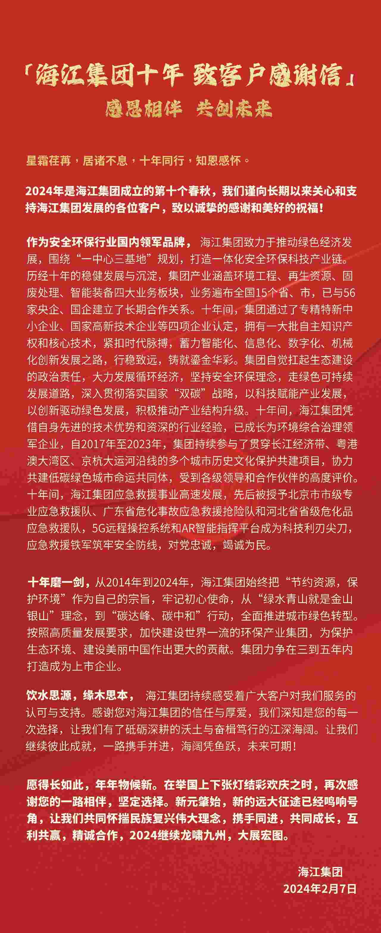 A thank-you letter from Haijiang Group to customers and friends over the past decade