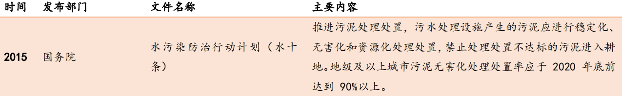 2015年“十三五”規(guī)劃出臺(tái),指出大氣、污水、污泥的治理是今后國內(nèi)環(huán)保處理的三個(gè)主攻方向?!笆濉币?guī)劃中明確了污泥處理處置目標(biāo)、任務(wù)與布局,建立完善了污泥穩(wěn)定化與無害化的相關(guān)標(biāo)準(zhǔn),并闡明了要加強(qiáng)監(jiān)管與激勵(lì)機(jī)制,全面地為我國未來五年的污泥處理處置工作做出了重要布局。