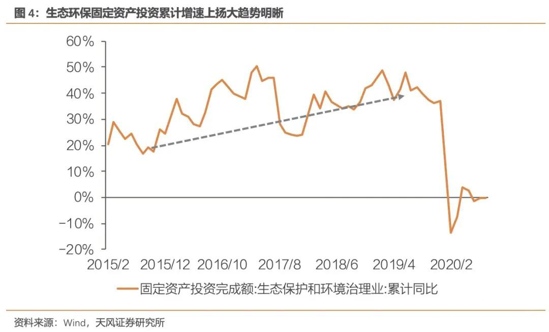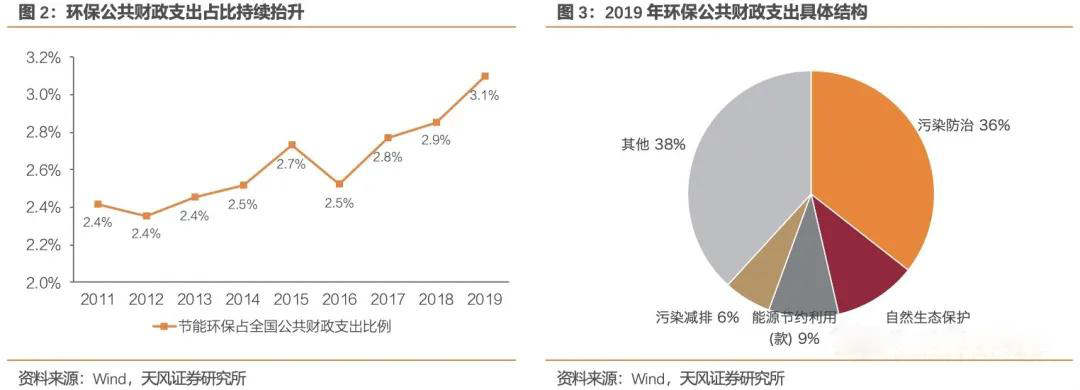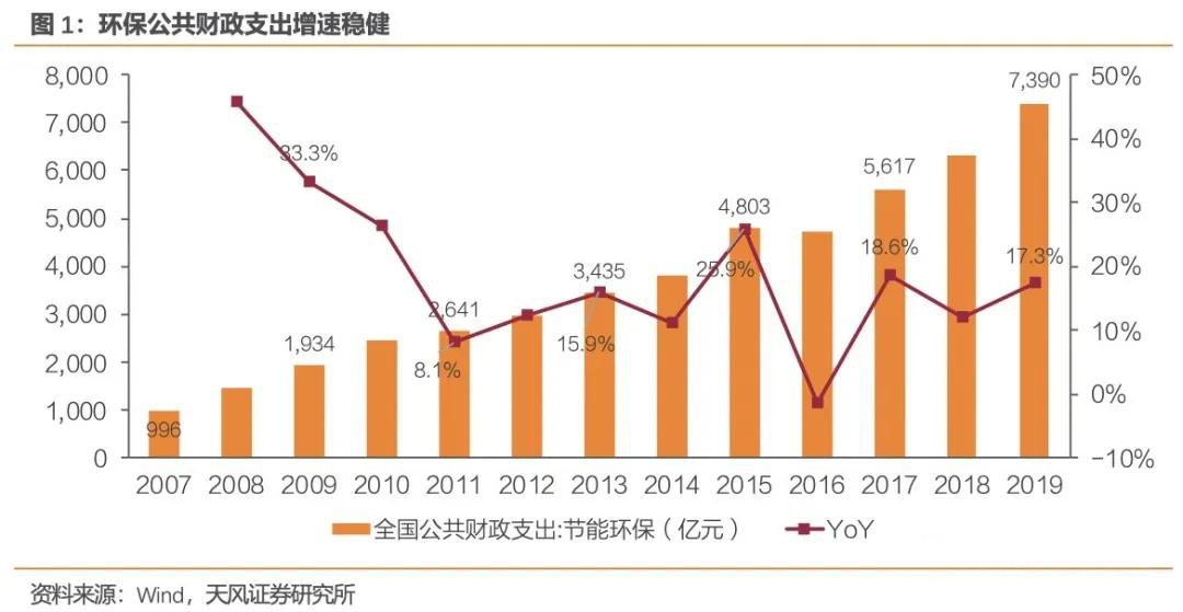 剛需屬性、優化供給,環保有望將成為內循環重要一環。一方面,環保剛需屬性明顯,本身即為需求重要組成部分。污染防治是我國全面建設小康社會的三大攻堅戰之一,同時也是環保行業所要解決的核心問題,行業具有天然的剛需特點。另一方面,環保拔高供給質量,也是大循環通道暢通的保障。從歷史趨勢來看,環保領域在國民經濟中重視度持續提高,近年財政支出增速十分穩健,2019年全國公共財政支出中節能環保支出7390億,同比增長17.3%,增幅環比抬升5.2個百分點,連續三年增速保持10%以上,且環保支出占總公共財政支出比例同樣持續抬升,一路從2016年的2.5%抬升至2019年的3.1%。我們認為,在國內大循環的新發展格局下,環保有望將成為內循環重要一環,行業景氣度有望持續抬升。