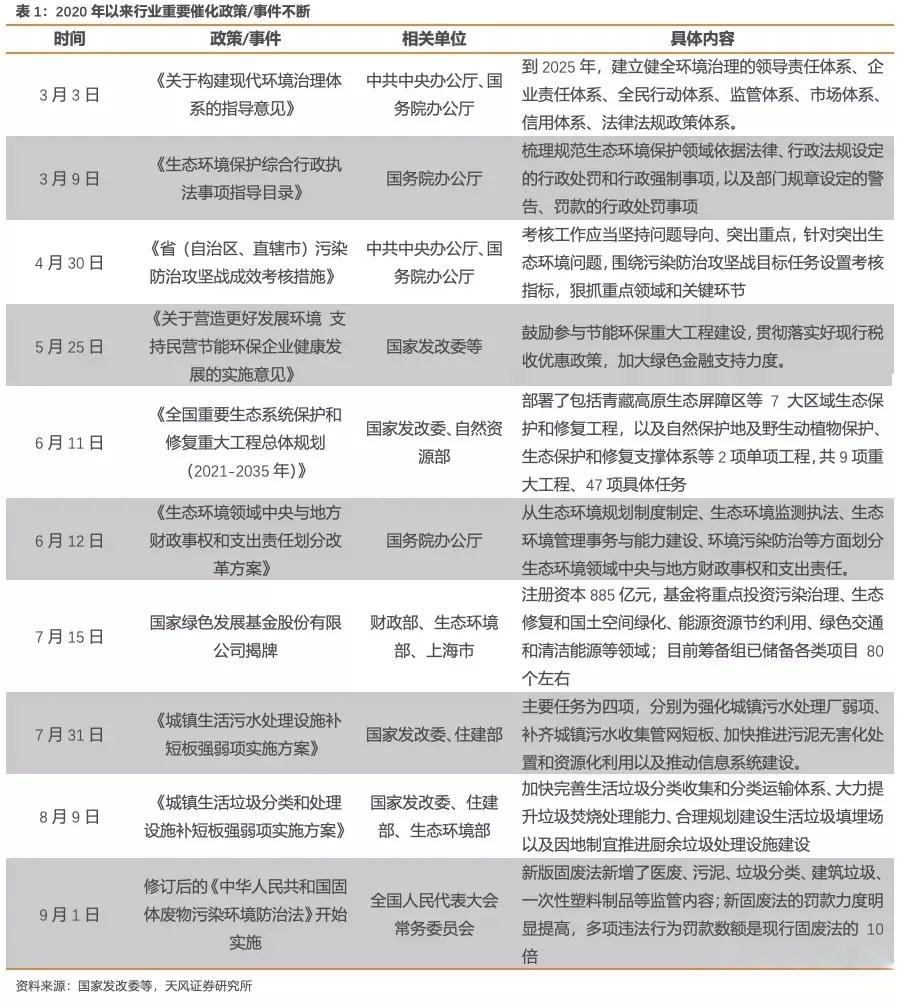 環保行業政策周期已開啟,2020年以來政策催化不斷。3月3日,中共中央辦公廳、國務院辦公廳印發了《關于構建現代環境治理體系的指導意見》。文件提出到2025年建成導向清晰、決策科學、執行有力、激勵有效、多元化參與、良性互動的環境治理體系。自三大污染防治行動方案之后,環保行業已經經歷很長時間的政策“空窗期”,這一指導意見是今后5年環保體系化建設的綱領性文件,后續配套文件將逐步落地,一定程度上標志著新一輪環保政策周期啟動。在這一綱領性文件引領下,2020年以來環保行業陸續迎來環保大基金、垃圾分類處理與生活污水補短板方案、新固廢法等等強政策催化,行業景氣度向上趨勢確立。