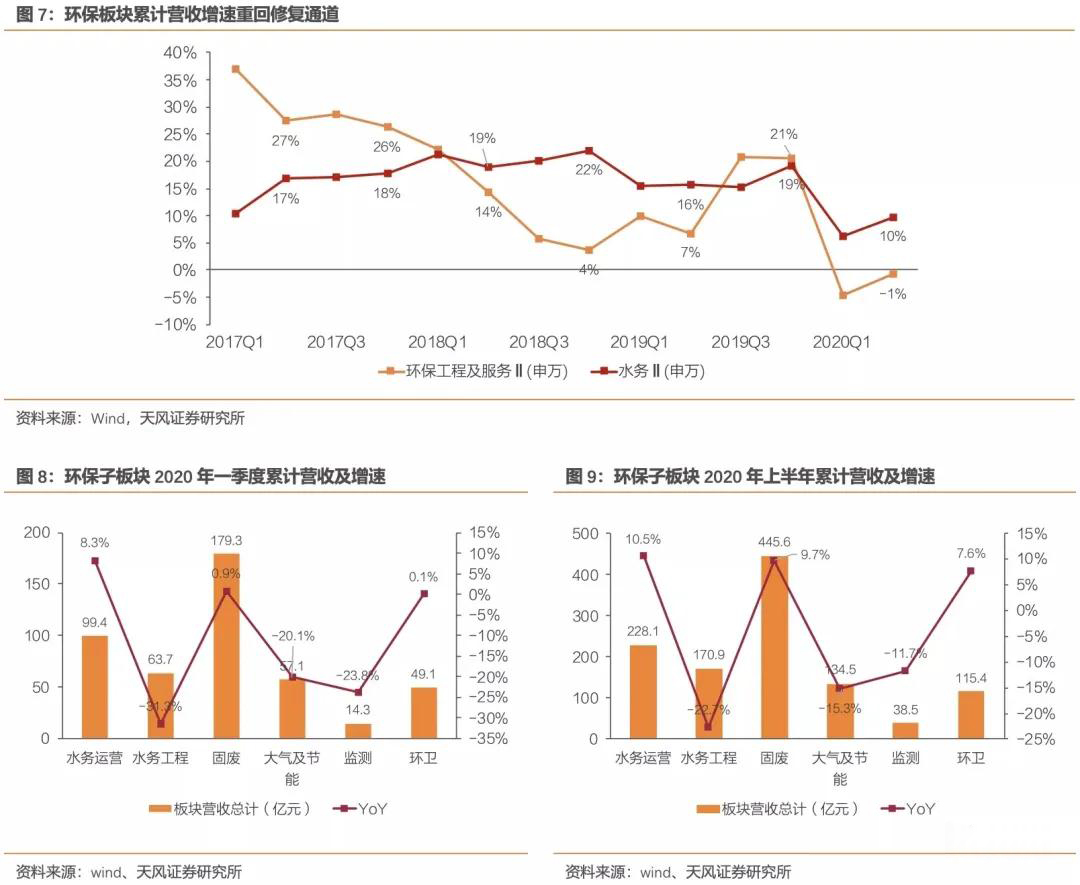 從微觀主體經營狀況來看,持續修復、重回景氣。2020年一季度,環保企業經營受疫情影響明顯,具體表現為工程進度延后、招投標工作受阻、運營需求下降等,整體營收及業績受到較大的拖累。但從半年報來看,行業整體修復狀況可觀,H1環保工程及服務、水務營收增速環比Q1分別修復了4.0和3.4個百分點。具體子行業來看,水務運營、固廢以及環衛體現出相對較高的景氣度,上半年營收同比分別增長10.5%、9.7%以及7.6%。