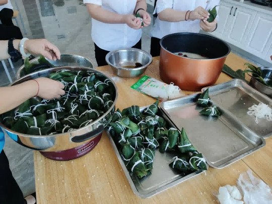 包粽子活動如約開始,大家提前將泡好的糯米、蜜棗、花生、粽葉等包粽子材料準備好,員工們圍站在一起,相互配合,折葉、盛糯米、配料、包裹、扎繩,一氣呵成,玲瓏小巧的粽子紛紛亮相。整個活動現場,氣氛輕松融洽,不時傳來大家陣陣的歡笑聲。